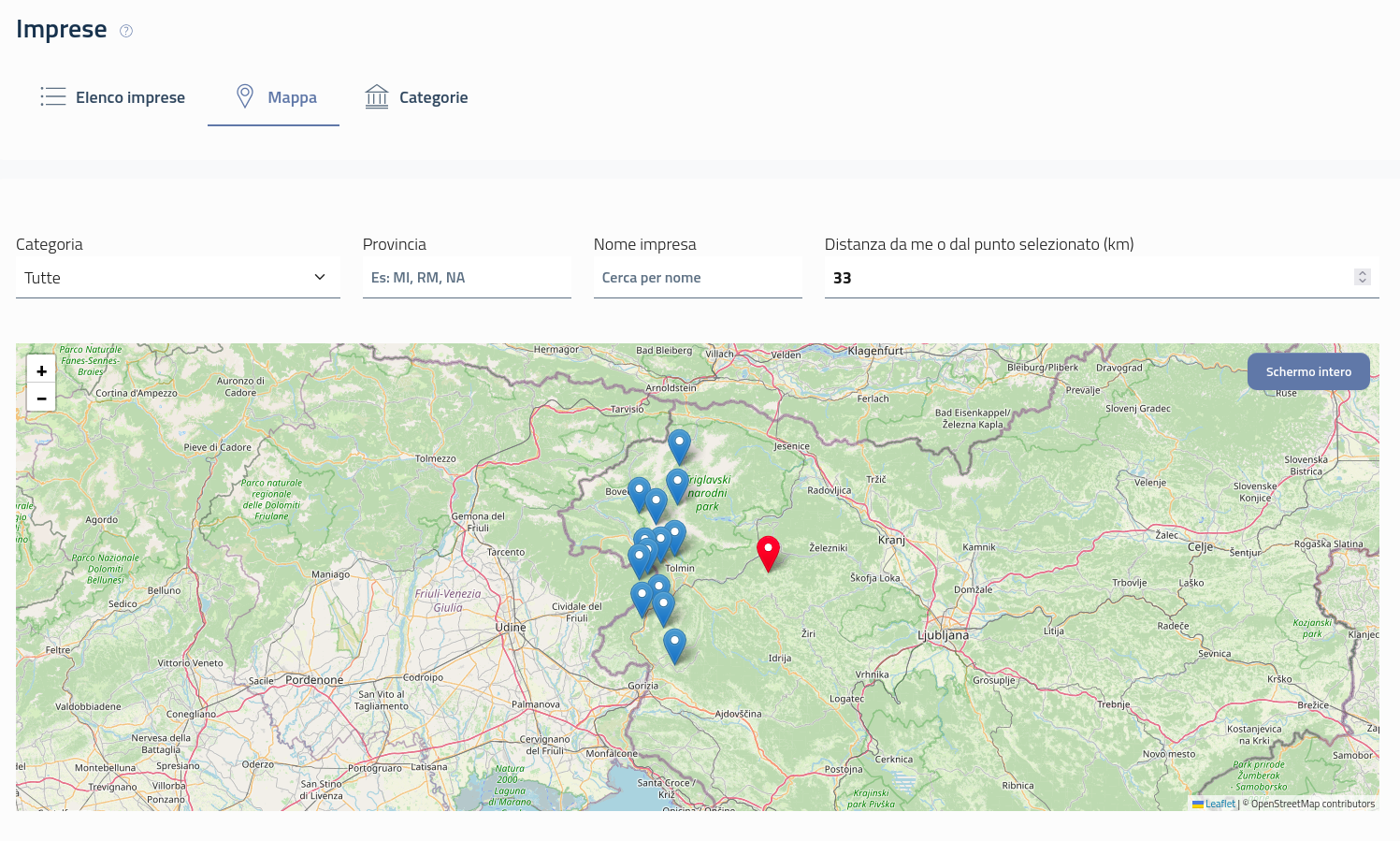 Dal pulsante evidenziato in giallo in cima alla pagina delle imprese è possibile accedere ad una pagina contenente una mappa con tutte le sedi delle imprese e la posizione dell’utente marcata da un segnalino rosso se si acconsente alla geolocalizzazione. Altrimenti sarà possibile inserire una posizione sulla mappa premendola o trascinando il segnalino rosso già esistente.