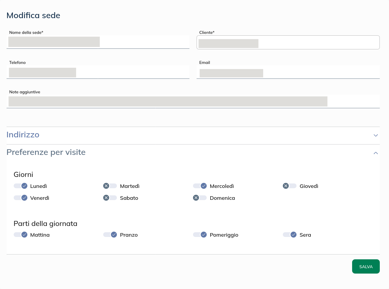 La parte mostrata nell’immagine è la più semplice, contenendo principalmente campi testuali o a selezione. Per le preferenze basterà selezionare i giorni e le fasce orarie nella quale la sede è aperta.