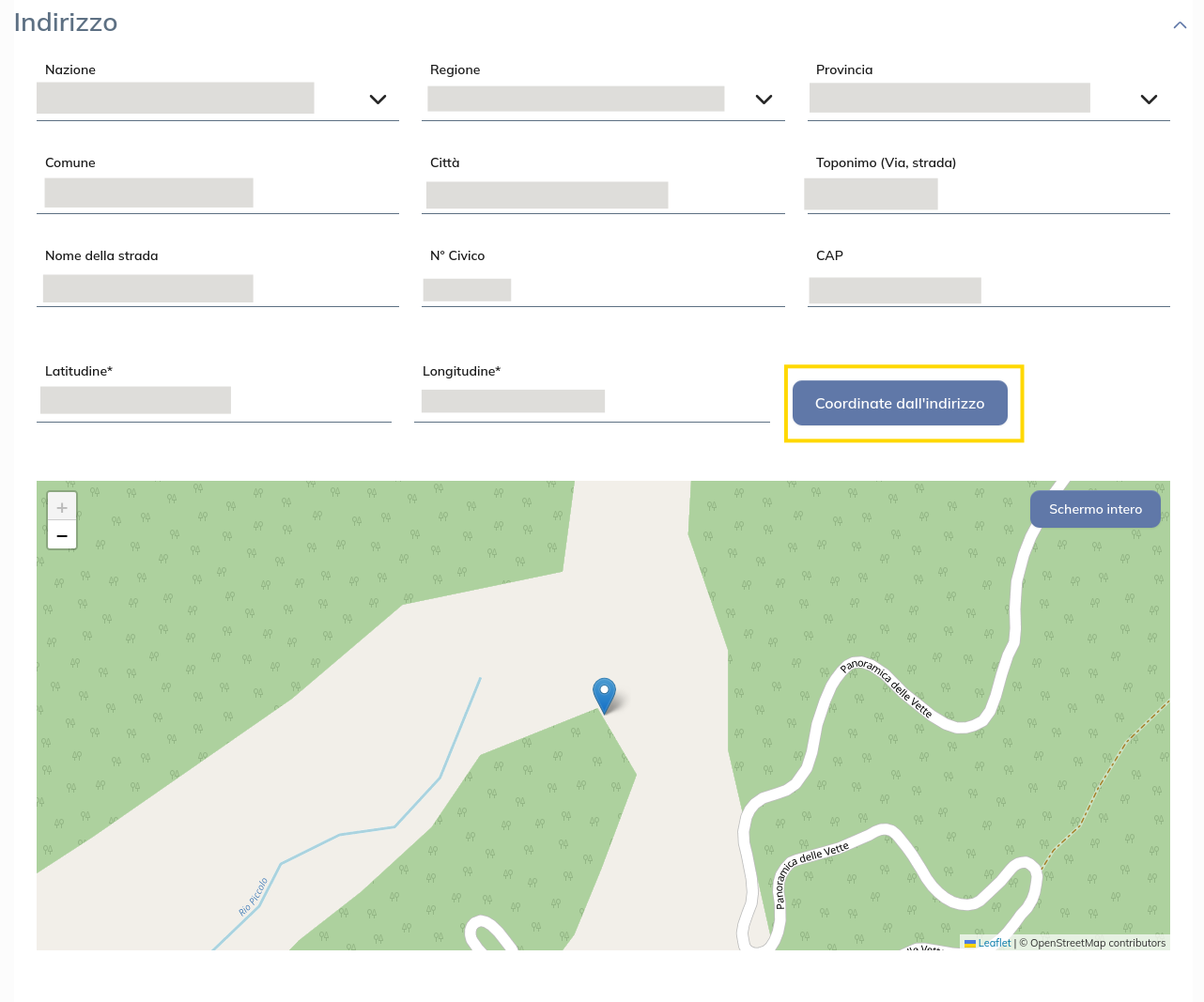 L’indirizzo è composto da campi testuali, campi di selezione e da una mappa. È compilabile nei seguenti modi: