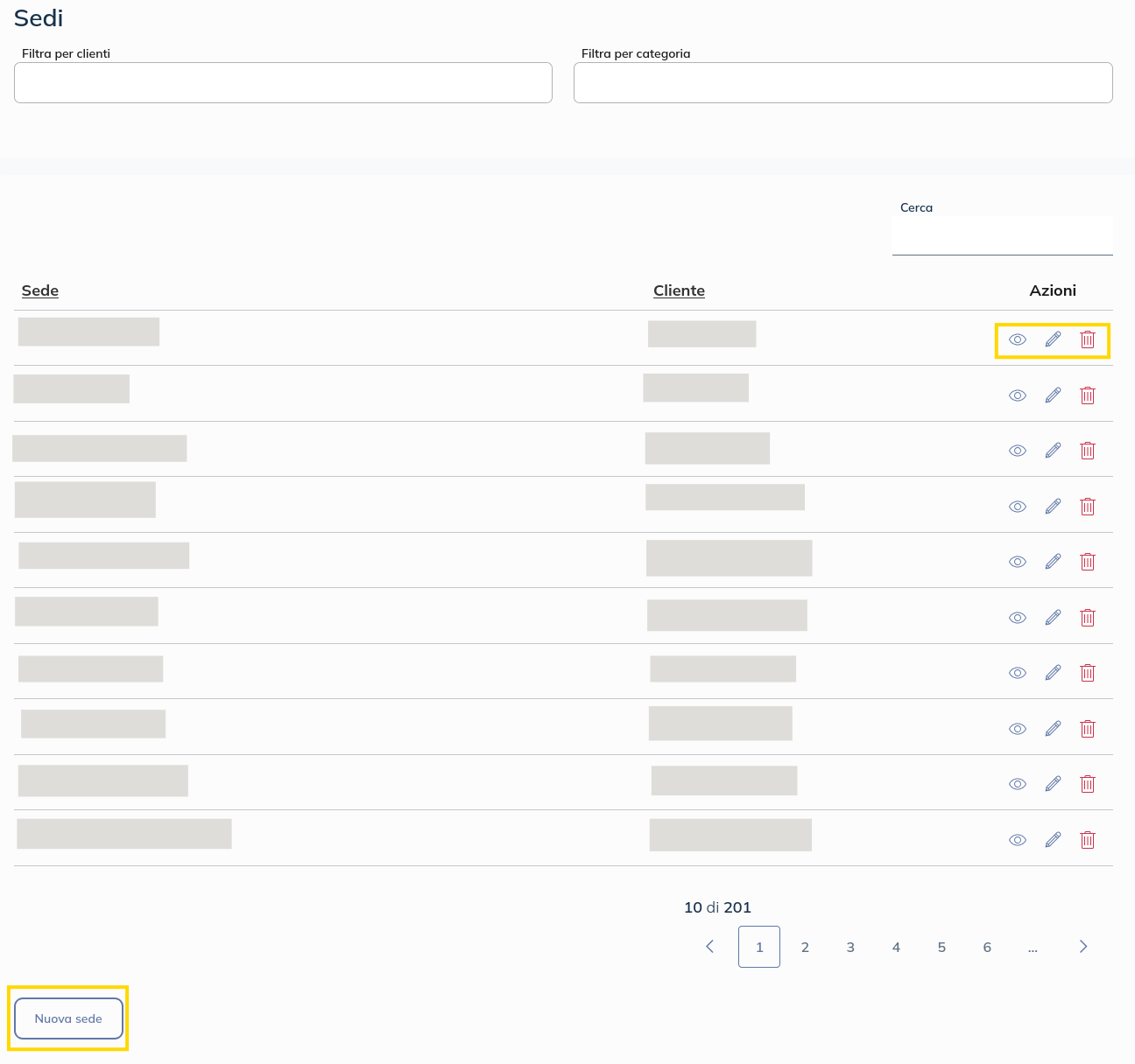 I pulsanti di creazione, dettaglio, modifica e cancellazione sono evidenziati in giallo nell’immagine. Per la cancellazione è richiesta una seconda conferma per evitare cancellazioni accidentali.