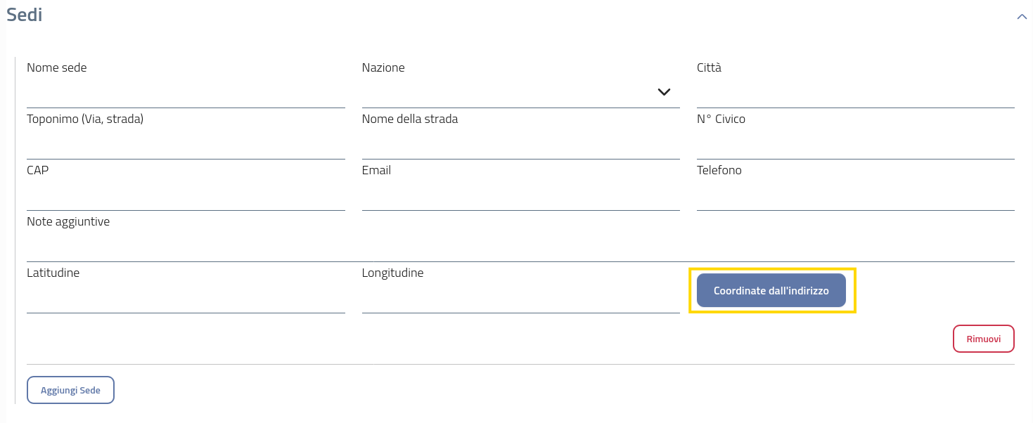 Questa sezione permette di creare, modificare o rimuovere una o più sedi in maniera agile senza dover passare per la pagina dedicata. Il pulsante «Coordinate dall’indirizzo» evidenziato in giallo nell’immagine permette di compilare i campi latitudine e longitudine automaticamente in base ai dati inseriti. Per la possibilità di selezionare le coordinate da mappa, visitare la pagina dedicata delle Sedi, descritta in seguito su questa pagina del manuale.