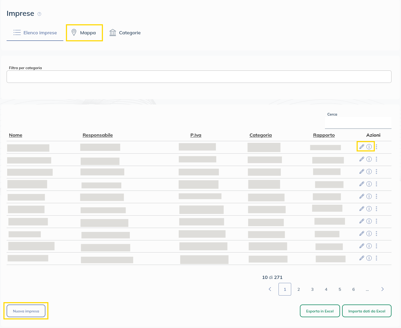 È possibile creare, modificare o rimuovere una nuova sede anche direttamente all’interno della modifica o creazione di un impresa, raggiunte premendo sull’icona a forma di matita o sul pulsante «Nuova impresa», evidenziati in giallo nell’immagine. La modifica, inserimento e creazione è possibile tramite la sezione «Sedi» della pagina, mostrata nell’immagine seguente.